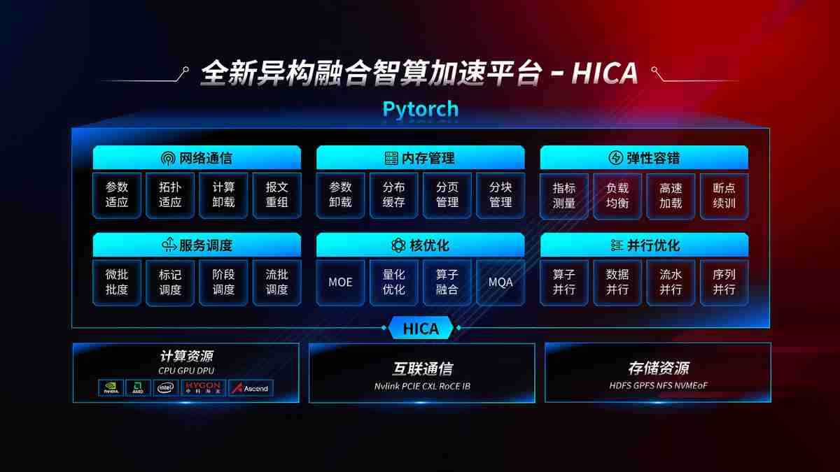 通过自研的服务层、、中间适配层、、以及调度编排算法,,,,采用数据并行、、、模型并行等多种并行方式,,把并行计算任务进行有效的分解,,使其分别由相应的软件栈和算力资源来承接。。。当GPU资源变化,,,HICA可以实时动态调度计算子任务并调整模型拓扑和架构,,,,以充分聚合各种算力资源。。